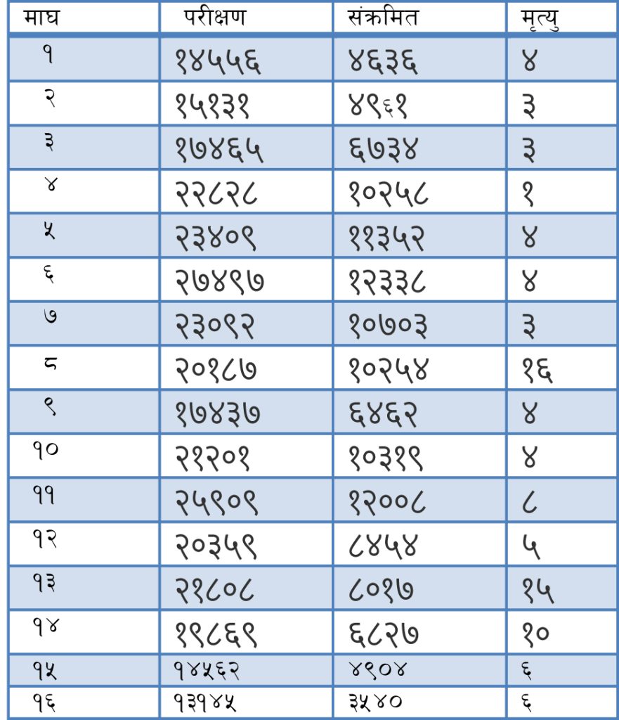 यस्तो छ माघ १ गतेदेखि हालसम्म परीक्षण सङ्क्रमित र मृतकको अवस्था