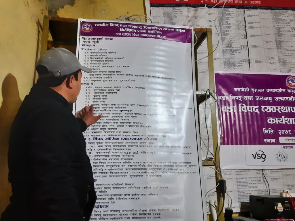 आज विहिवार एक औपचारिक कार्यक्रममा वडा अध्यक्ष,वडा पदाधिकारी, वडा विपद व्यवस्थापन समितिका पदाधिकारी, वडा स्थित विभिन्न राजनिती दल, शिक्षक, कर्मचारी, बुद्धिजीवी लगायत वडाका विभिन्न व्यक्तिहरुको उपस्थितिमा तथा युवा र युवा क्लबका सदस्यहरुको सक्रिय सहभागीतामा वडा विपद् व्यवस्थापन तथा जलवायु उत्थानशील योजना अनुमोदन गरिएको हो ।