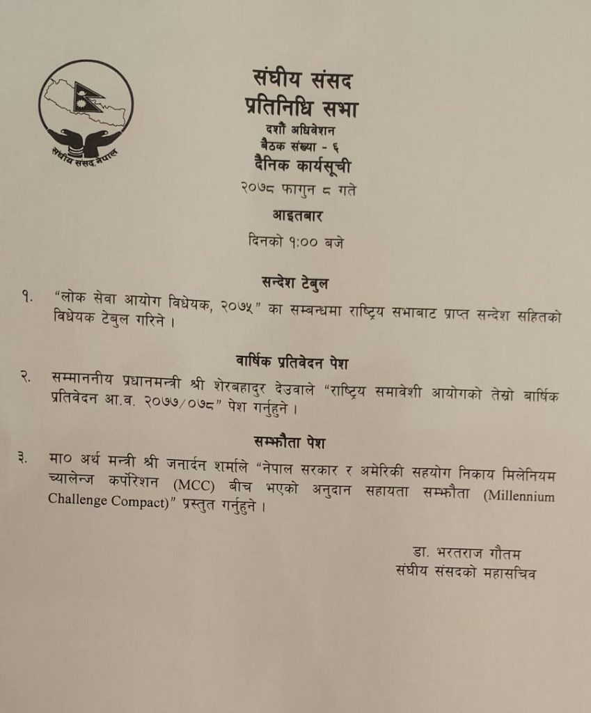 एमसीसी टेबल गर्ने यस्तो छ संसद्को कार्यसूची