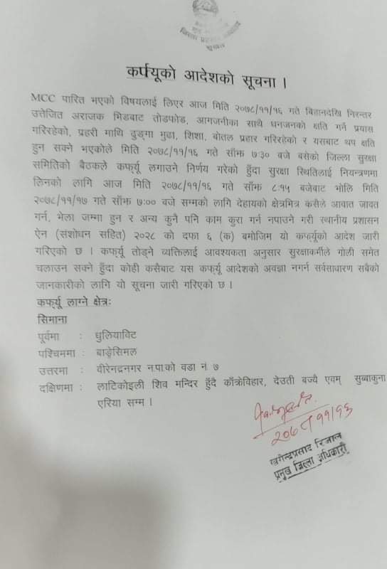 नेत्रविक्रम चन्द विप्लव नेतृत्वको नेकपासहित ६ दलले गरेको बन्दका क्रममा सोमबार साँझ एमसीसी विरोधी प्रदर्शन चर्किएको थियो । प्रदर्शन नियन्त्रण बाहिर गएको भन्दै स्थानीय प्रशासनले सोमबार बेलुकी सवा ८ बजेदेखि मंगलबार साँझ ७ बजेसम्मका लागि कर्फ्यू आदेश जारी गरेको हो ।