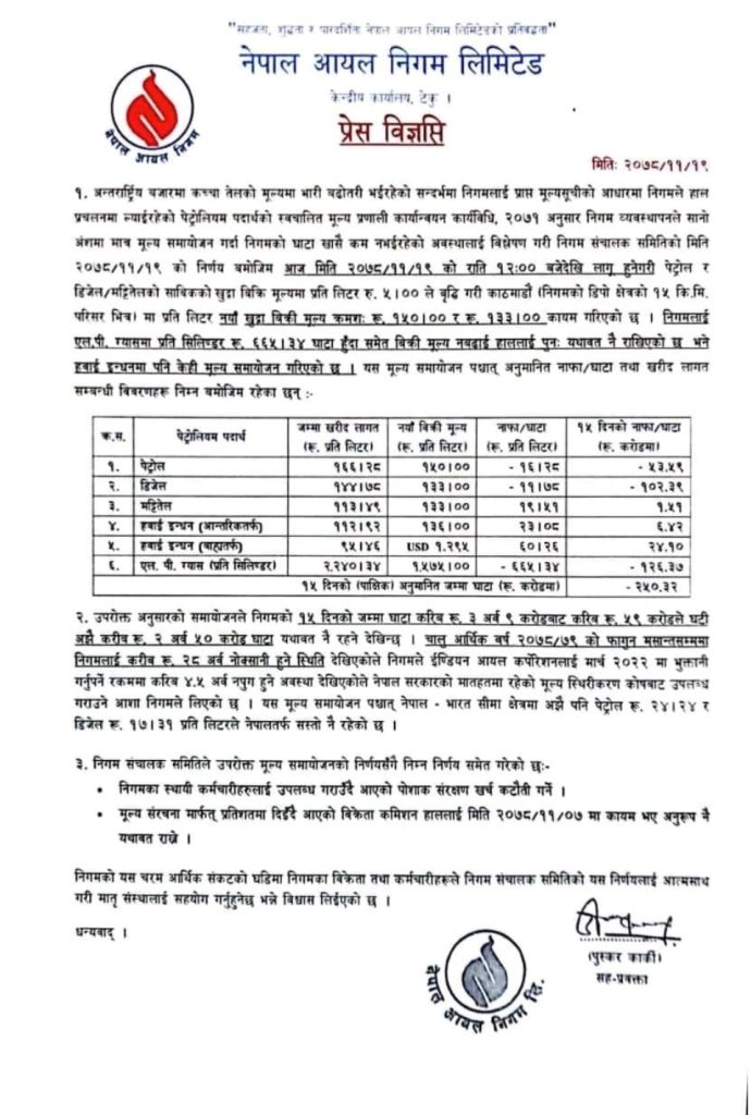 निगमका अनुसार ५-५ रूपैयाँ मूल्य बढे पनि पेट्रोलमा अझै ११ रूपैयाँ २८ पैसा घाटा छ। यस्तै डिजेलमा ११ रूपैयाँ ७८ पैसा घाटा र मट्टितेलमा १९ रूपैयाँ ५१ पैसा फाइदा छ।