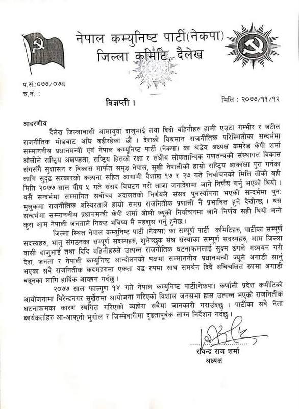 पार्टीका जिल्ला अध्यक्ष रविन्द्रराज शर्माद्वारा जारी गरिएको विज्ञप्तिमा भनिएको छ, २०७७ फाल्गुन १४ गते नेपाल कम्युनिस्ट पार्टी नेकपा कर्णाली प्रदेश कमिटीको आयोजनामा वीरेन्द्रनगर सुर्खेतमा आयोजना गरिएको विशाल जनसभा हाल उत्पन्न भएको राजनीतिक घटनाक्रमका कारण स्थगित भएको जानकारी गराउँदछु।