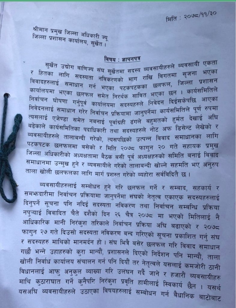 वाणिज्य संघमा तालाबन्दी गर्दै उनिहरुले जिल्ला प्रशासन कार्यालय सुर्खेतलाई ज्ञापन–पत्र बुझाइएको छ