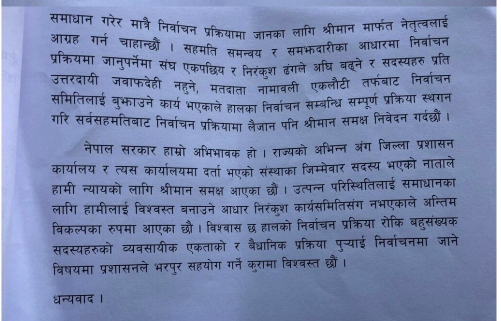 यस्तै, संघका सदस्य व्यवसायीहरुले व्यवसायी एकता र हितका लागि सदस्यता नविकरणको माग राखि विगतमा सृजना भएका विवादहरुलाई समाधान गर्न भएका पटक–पटकका छलफल गरिएको कार्यसमितिले निर्वाचन घोषणा गर्नुपूर्व कार्यालयमा सदस्यहरुले निवेदन दिईसकेपछि आएका निवेदनलाई समाधान गरेर निर्वाचन प्रक्रियामा जानुपर्नेमा कार्यसमितिले पूर्ण रुपमा त्यसलाई एजेण्डा समेत नबनाई पूर्वाग्रही ढंगले बहुमतको हुर्मत देखाई अघि बढेकाले र कार्यसमितिका पदाधिकारी तथा सदस्यहरुले नोट अफ डिसेन्ट लेखेको र व्यवसायीहरुले तालाबन्दी समेत गरेका थिए ।