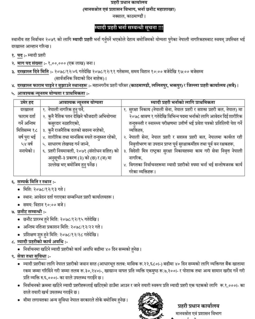 नेपाल प्रहरीले एक लाख जना म्यादी प्रहरीका लागि भर्ना खोलेको हो । इच्छुकले यही चैत ६ देखि ११ गतेसम्म आवेदन दिन पाउनेछन् ।