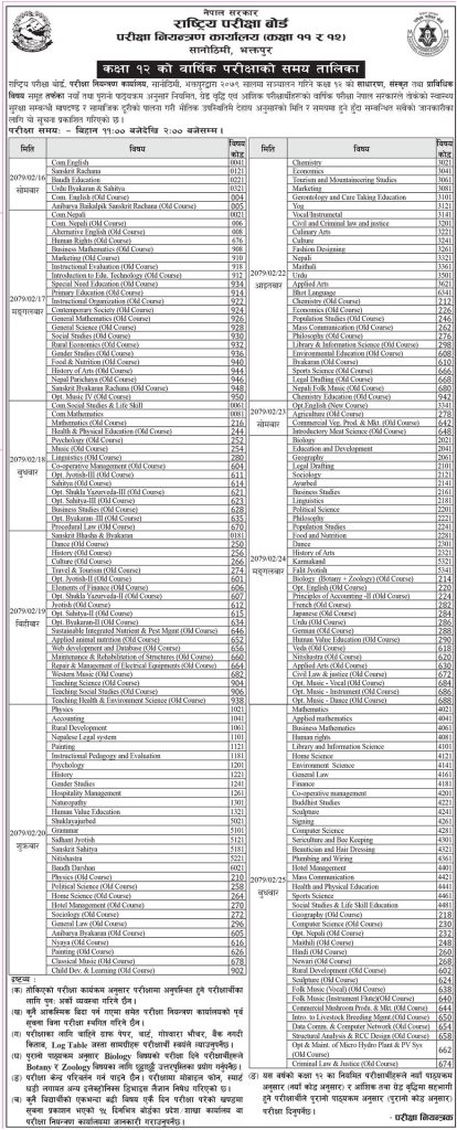 काठमाण्डाै । राष्ट्रिय परीक्षा बोर्ड, परीक्षा नियन्त्रण कार्यालय भक्तपुरले कक्षा १२ को वार्षिक परीक्षाको समय तालिका सार्वजनिक गरेकाे छ । बाेर्डले २०७९ जेठ १६ गतेदेखि हुने परीक्षाको समय तालिका सार्वजनिक गरेको हो ।
