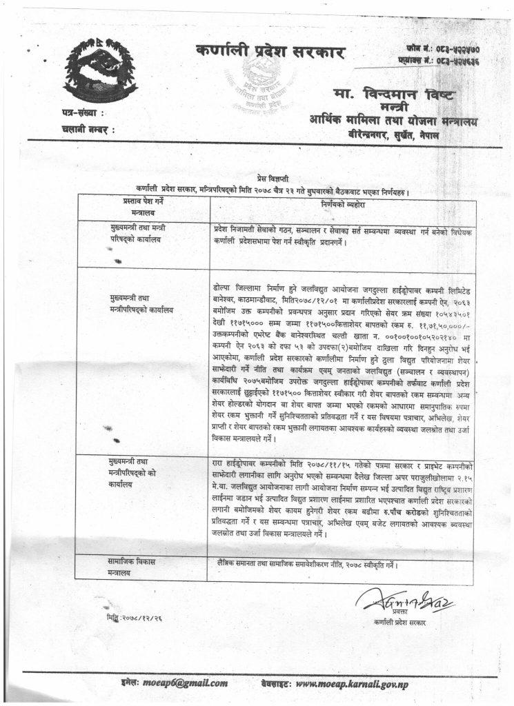 यस्तै दैलेखको अपर पराजुली खोलामा सम्पन्न भएको २.१५ मेगावाटको जलविद्युत आयोजनामा प्रदेश सरकारले लगानी बमोजिम पाँच करोड सुनिश्चित गर्ने बैठकले निर्णय गरेको छ ।