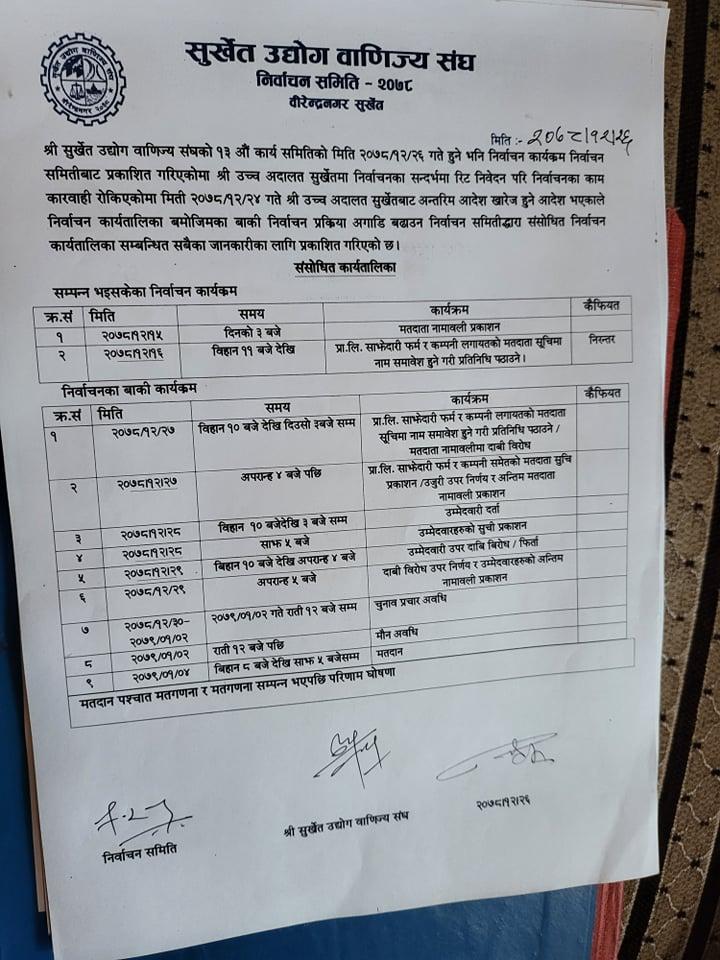 सुर्खेत बाणिज्य संघकाे बैशाख ४ गते निर्वाचन मिति ताेकियाे, उम्मेद्वारी दर्ता साेमबार