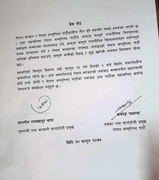 सरकार र विप्लव बिच भएको तीन बुँदे सहमति पत्र