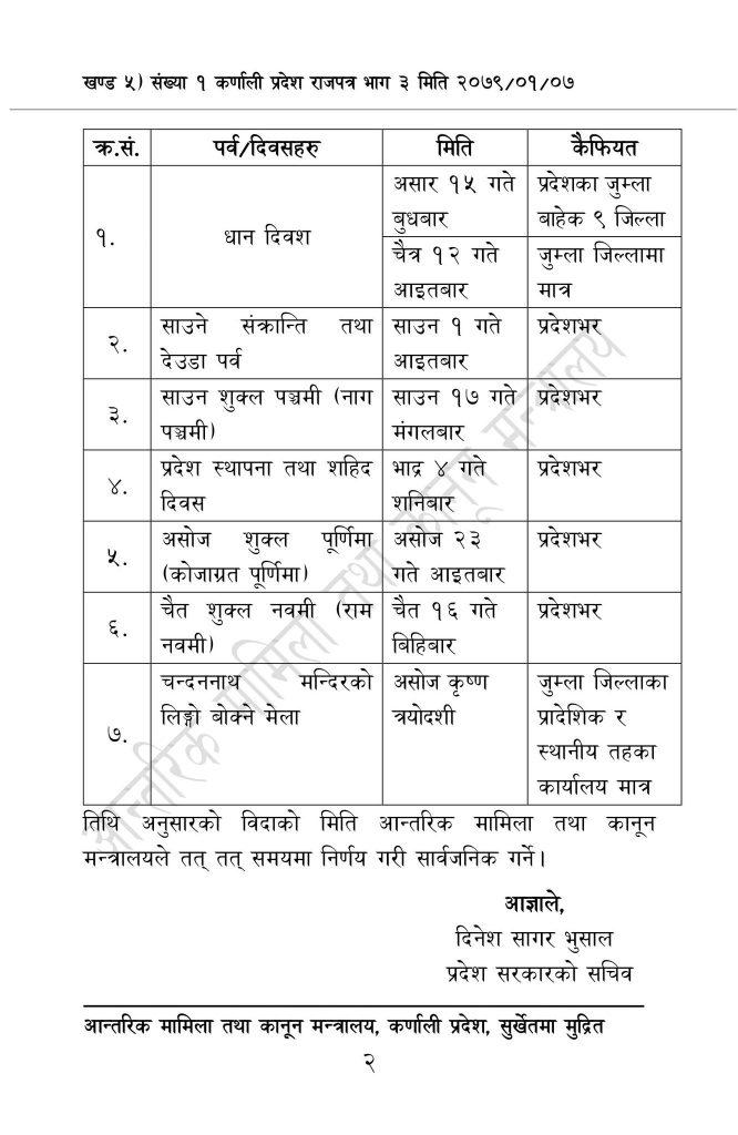 साउने संक्रान्ति तथा देउडा पर्व साउन १ गते, नाग पञ्चमी साउन १७ गते, प्रदेश स्थापना तथा शहिद दिवस भदौ ४ गते, कोजाग्रत पूर्णिमा असोज २३ गते, राम नवमी चैत १६ गते र चन्दननाथ मन्दिरको लिंगो बोक्ने मेला असोज कृष्ण त्रयोदशी जुम्ला जिल्लामा मात्र विदा दिने निर्णय गरिएको हो । प्रदेशको आन्तरिक मामिला तथा कानून मन्त्रालयले राजपत्रमा सूचना प्रकाशन गरेर विदाहरु सार्वजनिक गरेको हो ।