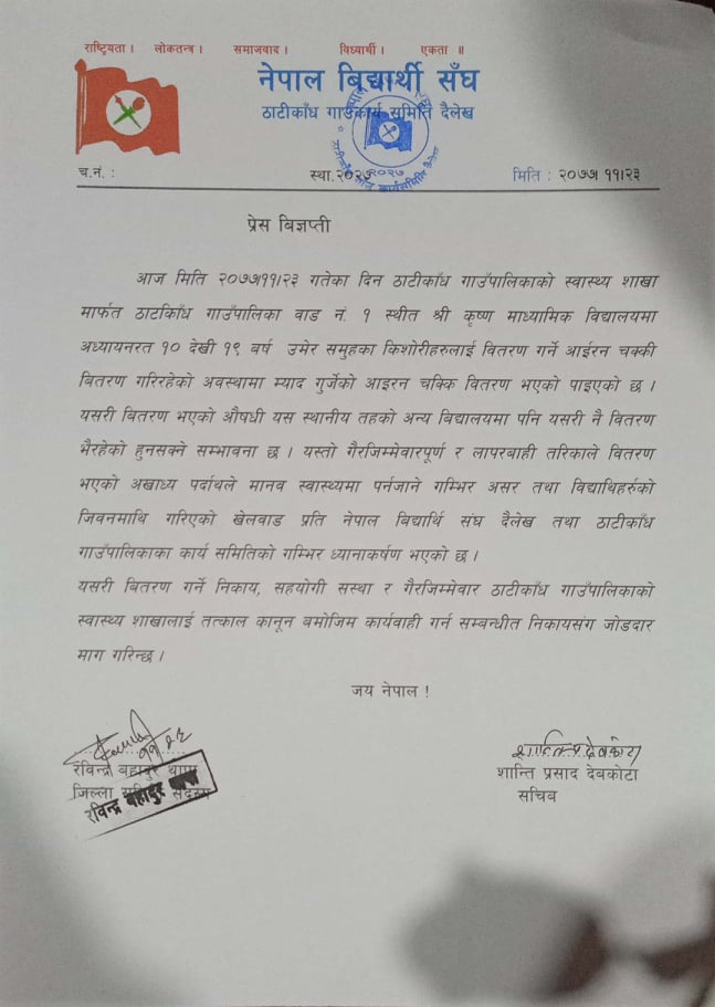 छात्रालाई वितरण गरेको आईरन चक्की,विरोध पछि फिर्ता