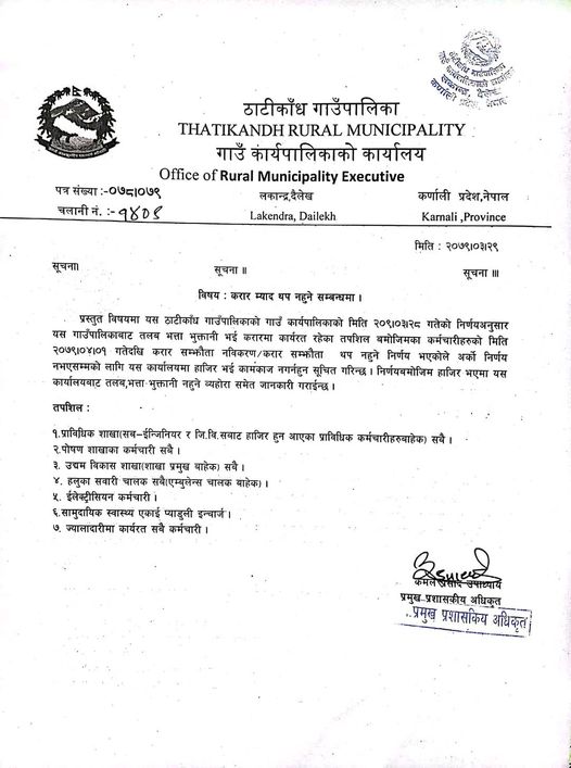 दैलेख। दैलेखको ठाटीकाँध गाउँपालिकामा कार्यरत करार कर्मचारी हटाएको छ। गाउँपालिकाको असार २८ गतेको बैठकले करार कर्मचारीको म्याद थप नगर्ने निर्णय गरेको हो।