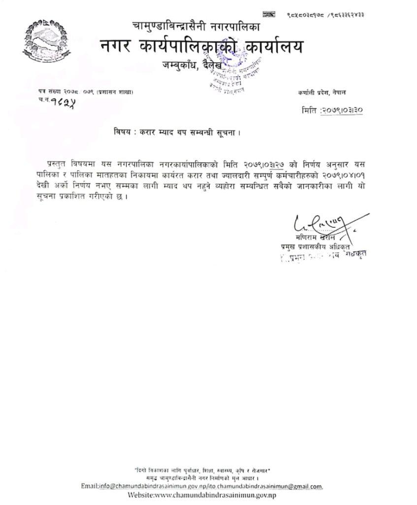 दैलेख । दैलेखको चामुण्डाविन्द्रासैनी नगरपालिकाले करार कर्मचारीको म्याद थप नगर्ने निर्णय गरेको छ ।