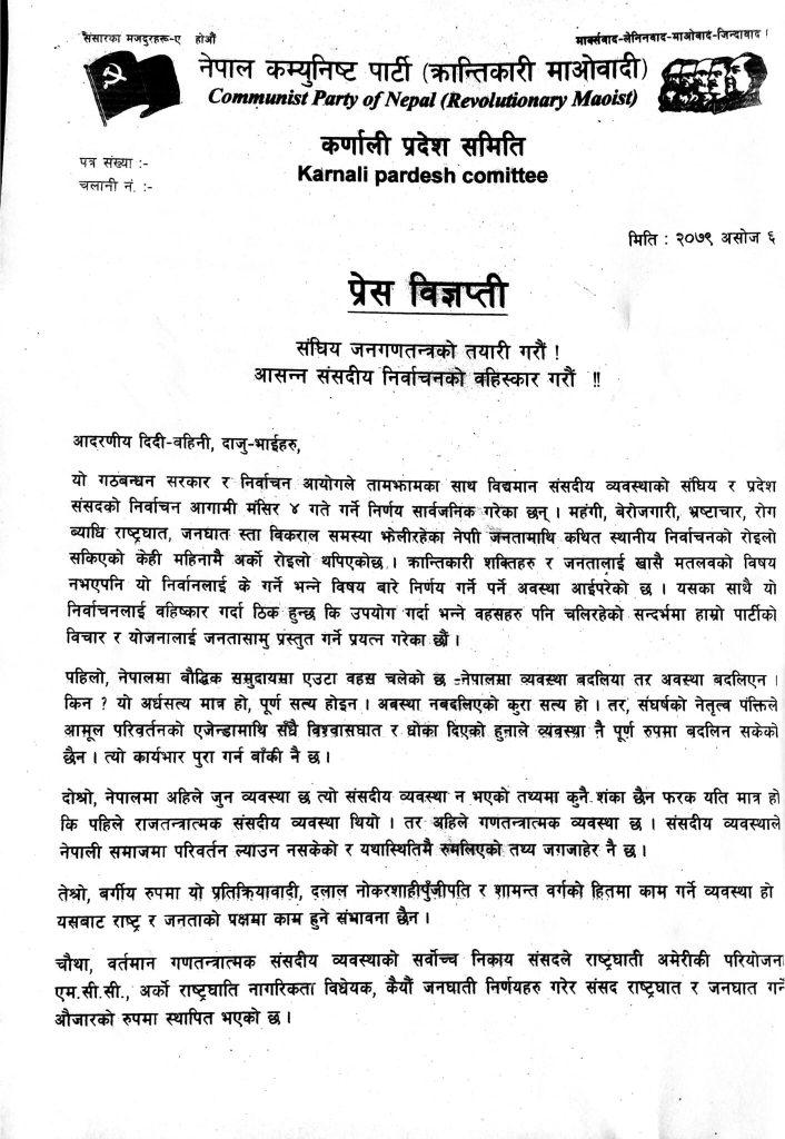प्रेस विज्ञप्ती सार्वजनिक गर्दै नेकपा (क्रान्तिकारी माओवादी) कर्णाली प्रदेश सेक्रेटरी दिपक बहादुर शाहीले निर्वाचनको निष्क्रिय बहिष्कार आत्मघाती हुने भएकोले सक्रिय बहिष्कार गरी यसको विकल्पको रुपमा संघीय जनगणतन्त्र स्थापना गर्न अघि बढ्ने बताए ।