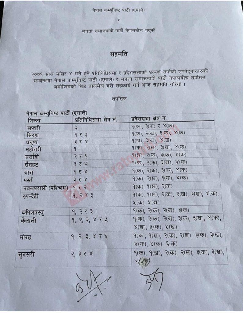 यसैगरी एमालेको समर्थनमा जसपा नेपालले सप्तरी १, २ र ४, सिरहा २ र ४, धनुषा १, महोत्तरी ३ र ४, सर्लाही १ र ४, रौतहट २, बारा २, पर्सा १ र २, रुपन्देही ४, मोरङ ५ र सुनसरी १ मा उम्मेदवारी दिनेछ ।