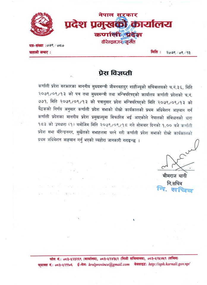 प्रथम अधिवेशन आह्वानको लागि बुधबार बसेको मन्त्रिपरिषदको बैठकले प्रदेश प्रमुखको कार्यालयलाई पत्र पठाएको थियो।
