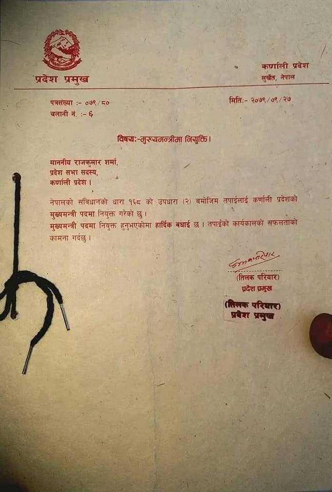 सुर्खेत । कर्णाली प्रदेशको तेस्रो मुख्यमन्त्रीमा नेकपा माओवादी केन्द्र संसदीय दलका नेता राजकुमार शर्मा नियुक्त भएका छन्।