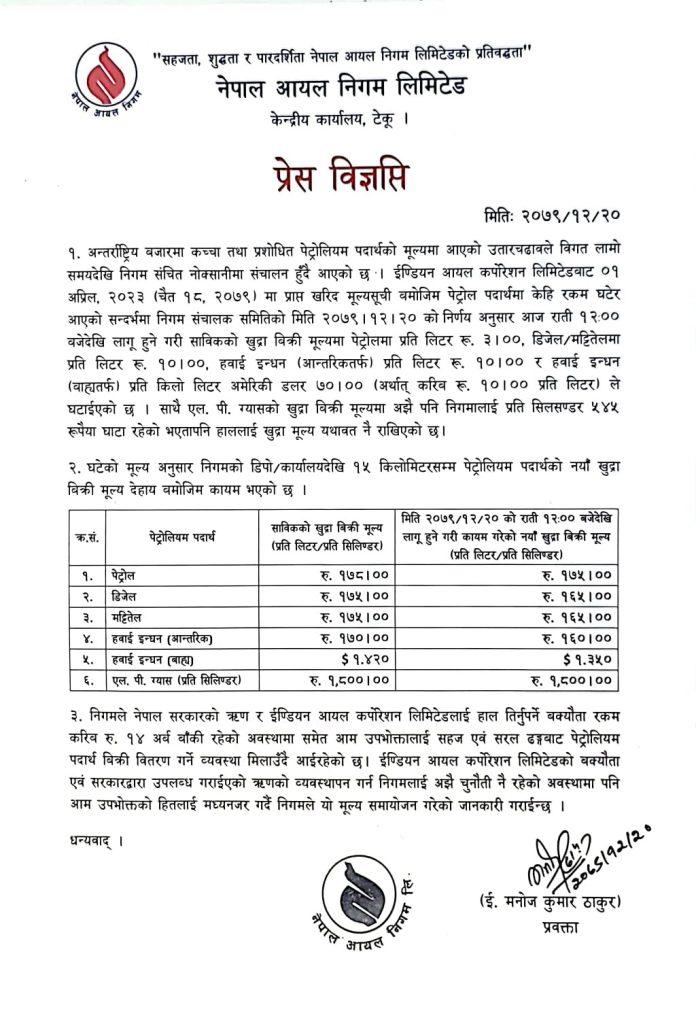 सोमबार राति १२ बजेदेखि नयाँ मूल्य लागू हुने निगमले जनाएको छ।