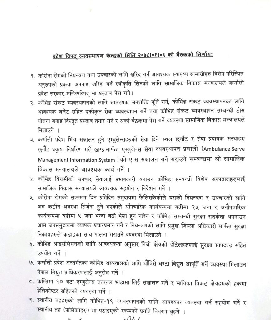 यस्तै कोभिड बिरामीहरुको उपचार सेवालाई प्रभावकारी बनाउन कोभिड सम्बन्धी विशेष अस्पतालहरुलाई सहयोग र निर्देशन दिने जिम्मा सामाजिक विकास मन्त्रालयलाई दिईएको छ । बैठकले कर्णाली प्रदेश अन्तरगर्तका कोभिड अस्पतालहरुमा चौबिसै घण्टा विद्युत आपूर्ति गर्ने, स्थानीय तहको लागि कोभिड–१९ व्यवस्थापनका लागि सहयोग गर्ने र स्थानीय तहलाई पठाईएको रकमको प्रगति विवरण बुझ्ने निणर्य समेत गरेको छ ।