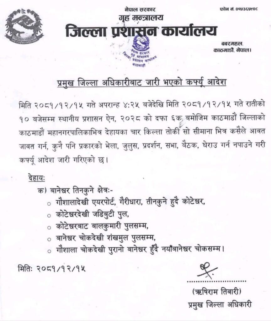 जिल्ला प्रहरी परिसर काठमाडौंका एसएसपी विश्व अधिकारीले कर्फ्यु आदेश जारी गरिएको जानकारी दिए। गौशालादेखि एयरपोर्ट, गैरीधारा, तीनकुने हुँदै कोटेश्वर, कोटेश्वरबाट जडिबुटी पुल, कोटेश्वरबाट बालकुमारी पुल, नयाँबानेश्वर चोकदेखि शंखमुल पुलसम्म र गौशाला चोकदेखि पुरानो बानेश्वर हुँदै नयाँ बानेश्वर चोकसम्म कर्फ्यु लगाइएको जिल्ला प्रशासन कार्यालयले जनाएको छ।