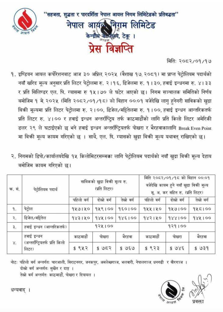 त्यस्तै हवाई इन्धनमा आन्तरिकतर्फ प्रतिलिटर चार रुपैयाँ मूल्य घटाइएको छ । नयाँ मूल्य अनुसार पेट्रोल पहिलो वर्गमा प्रतिलिटर १५५,दोस्रो वर्गमा १५७ र तेस्रो वर्गमा १५८ रुपैयाँ कायम गरिएको छ । त्यस्तै डिजेल र मट्टीतेल पहिलो वर्गमा १४२,दोस्रो वर्गमा १४४,तेस्रो वर्गमा १४५ कायम गरिएको छ । हवाई इन्धन आन्तरिकतर्फ १२१ कायम गरिएको छ ।