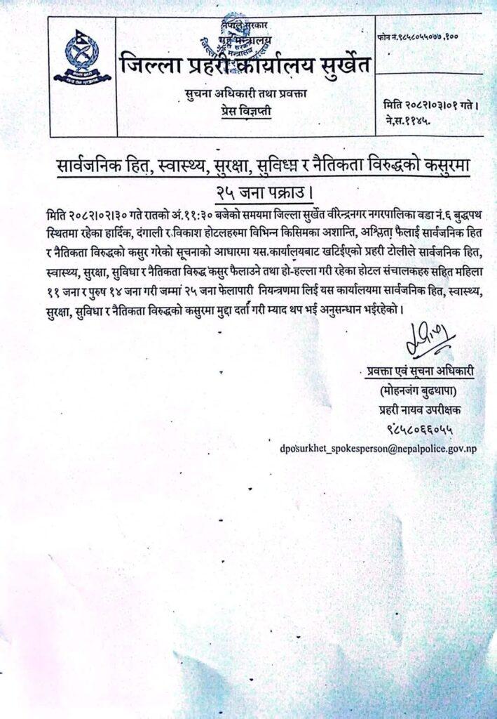 सुर्खेत । जिल्ला प्रहरी कार्यालय सुर्खेतले सार्वजनिक हित, स्वास्थ्य, सुरक्षा, सुविधा तथा नैतिकता विपरीत गतिविधिमा संलग्न भएको अभियोगमा २५ जनालाई पक्राउ गरेको छ।