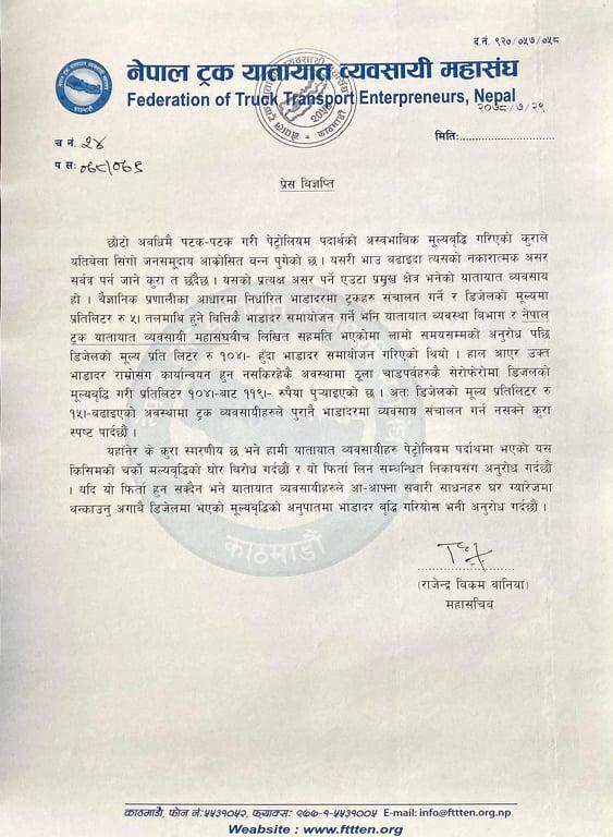 नेपाल ट्रक यातायात व्यवसायी महासंघले पेट्रोलियम पदार्थको मूल्य घटाउन वा त्यसअनुसारको भाडादर बढाउन माग गरेको छ।