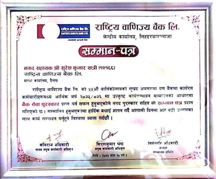 सुर्खेत । राष्ट्रिय वाणिज्य बैंक शाखा कार्यालय दैलेखमा कार्यरत सुरेश कुमार खत्रीले ‘बैंक सेवा पुरस्कार’ प्राप्त गरेका छन् । राष्ट्रिय वाणिज्य बैंक केन्द्रीय कार्यालयले उनलाई ‘बैंक सेवा पुरस्कार’ बाट सम्मान गरेको हो । दैलेख शाखामा नगद सहायक पदमा कार्यरत खत्रीलाई बैंकले ‘बैंक सेवा पुरस्कार’ बाट सम्मान गरेको हो ।