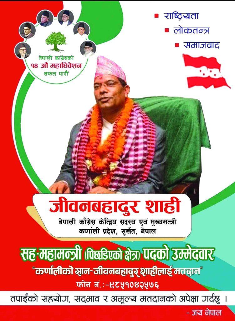 सुर्खेत। कर्णालीका मुख्यमन्त्री जीवनबहादुर शाहीले नेपाली काँग्रेसको केन्द्रीय कार्यसमितिको सहमहामन्त्री पदमा उम्मेदवारी घोषणा गरेका छन् । पार्टीको केन्द्रीय सदस्य समेत रहेका उनले पिछडिएको क्षेत्रबाट उम्मेदवारी घोषणा गरेका हुन् ।
