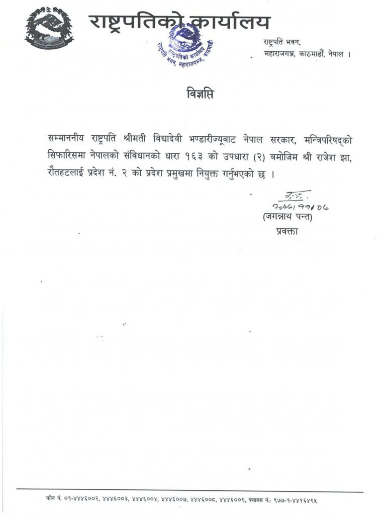 काठमाडौं : राष्ट्रपति विद्यादेवी भण्डारीले प्रदेश २ को प्रदेश प्रमुखमा राजेश झालाई नियुक्त गरेकी छन् । प्रदेश प्रमुख तिलक परियारलाई पदमुक्त गरे लगत्तै राष्ट्रपति भण्डारीले झालाई नियुक्त गरेकी हुन् ।नेपालको संविधानको धारा १६३ को उपधारा (२) बमोजिम झालाई प्रदेश प्रमुखमा नियुक्त गरेको राष्ट्रपति कार्यालयका प्रवक्ता जगन्नाथ पन्तले जानकारी दिए । परियार २०७६ कार्त्तिक १८ गते प्रदेश २ को प्रदेश प्रमुखमा नियुक्त भएका थिए ।